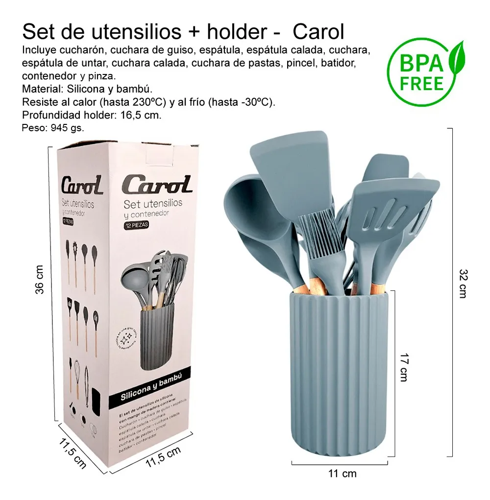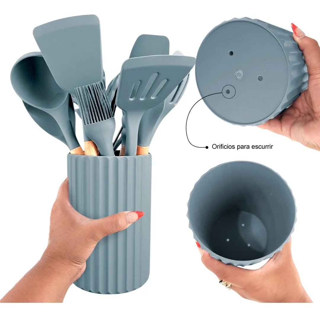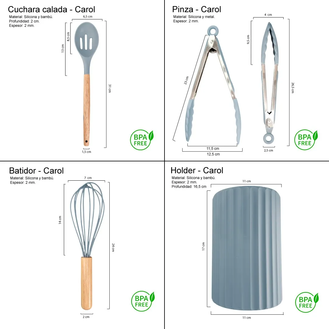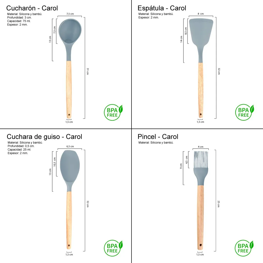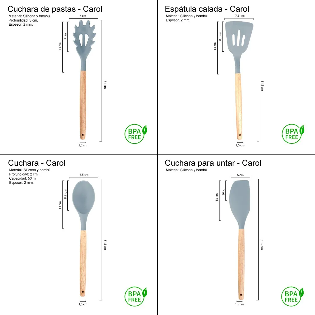 - Los utensilios son de silicona, lo que los hace antiadherentes, resistentes al calor y seguros para usar en ollas y sartenes sin rayar las superficies.